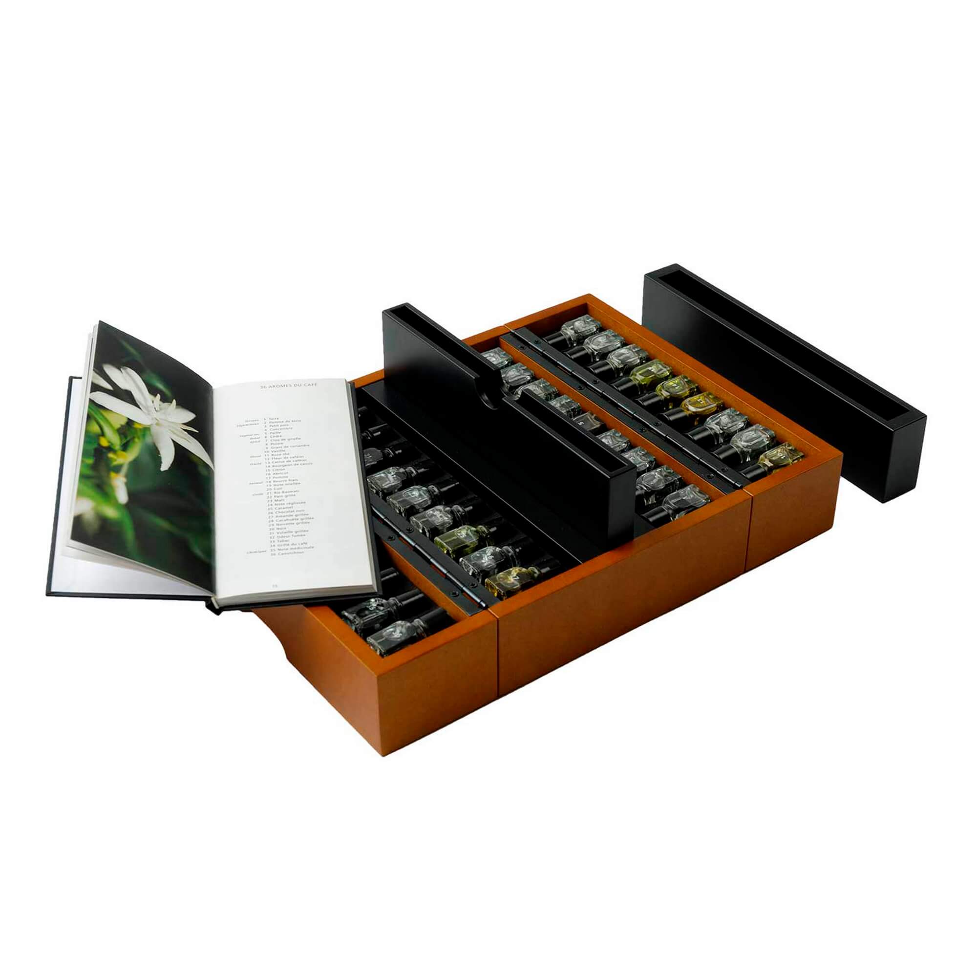 Произведённый во Франции, этот набор включает 36 флаконов с тщательно подобранными натуральными ароматами, а также буклет с подробными описаниями. Все элементы выполнены из высококачественных материалов — эфирных масел, стекла и дерева — и упакованы в стильный кейс коричнево-чёрной гаммы. При весе 0,9 кг и размерах 16,5 × 33 × 22 см, коллекция удобно размещается на столе и подходит как для персонального использования, так и для образовательных целей в школах бариста, кафе и дегустационных залах.