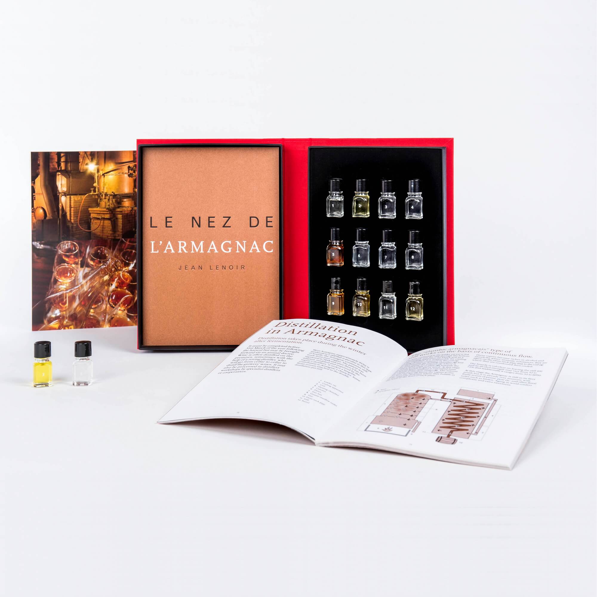 Набор изготовлен во Франции из высококачественных материалов: эфирные масла, пластик, стекло. В комплект входят 12 флаконов с основными ароматами арманьяка, обучающие карточки и буклет с описанием. Упаковка весом 0,7 кг выполнена в насыщенных оттенках красного, коричневого и чёрного, что подчёркивает премиальность коллекции. Компактный размер (28 × 18 × 4,5 см) делает её удобной для хранения, транспортировки и использования в любой обстановке — от дегустационного зала до домашней библиотеки.